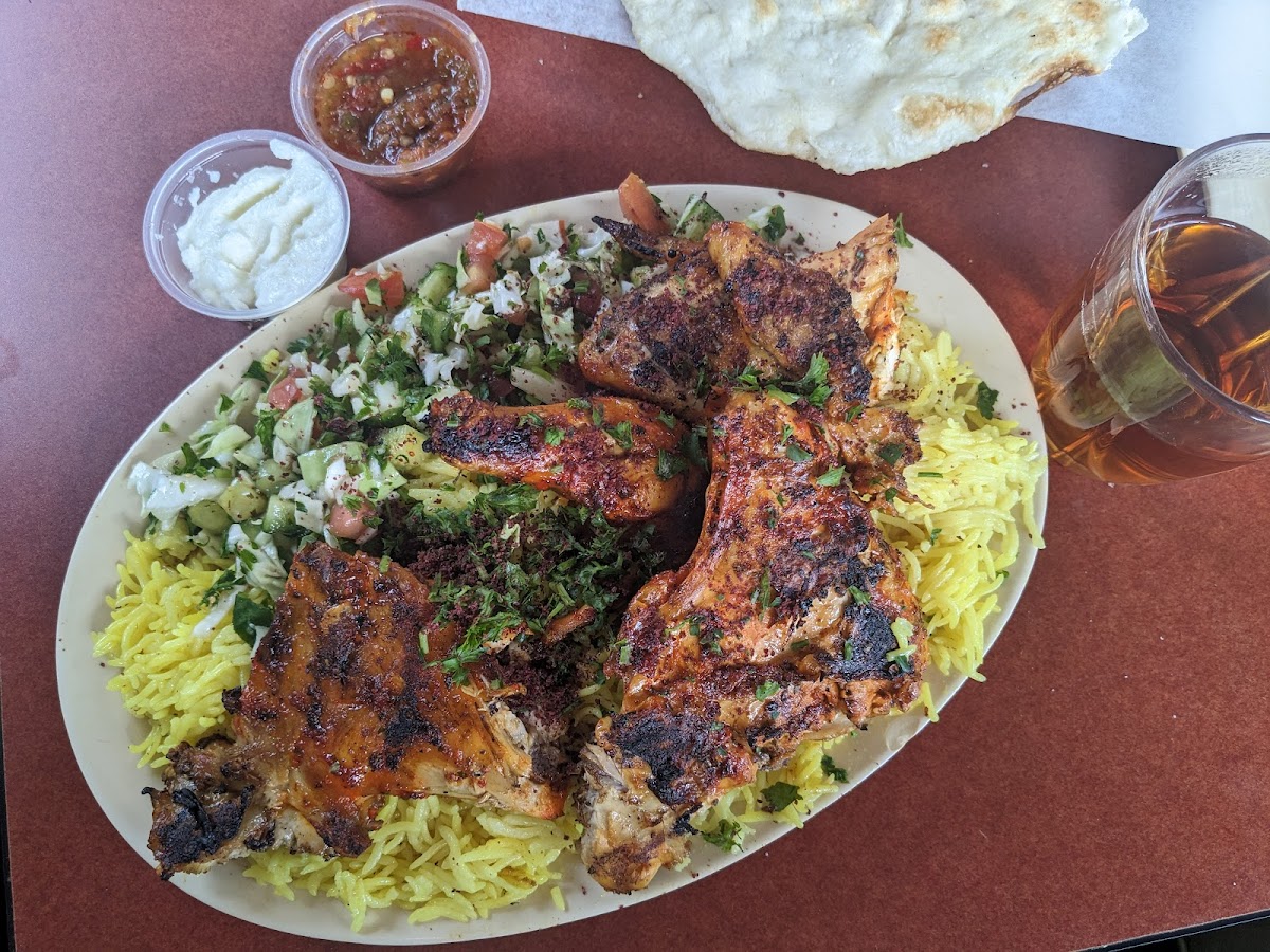 Menu selections spotlight grilled meats like lamb chops, lamb and beef kebabs, and chicken shawarma, often served alongside rice and fresh salads such as Turkish or tabouleh salad. A standout is the half or whole roasted chicken served with rice and salad—a classic comfort choice that’s simple yet full of flavor. The hummus with meat and baba ghanoush appetizers add depth to the meal and make for a rich, traditional start.